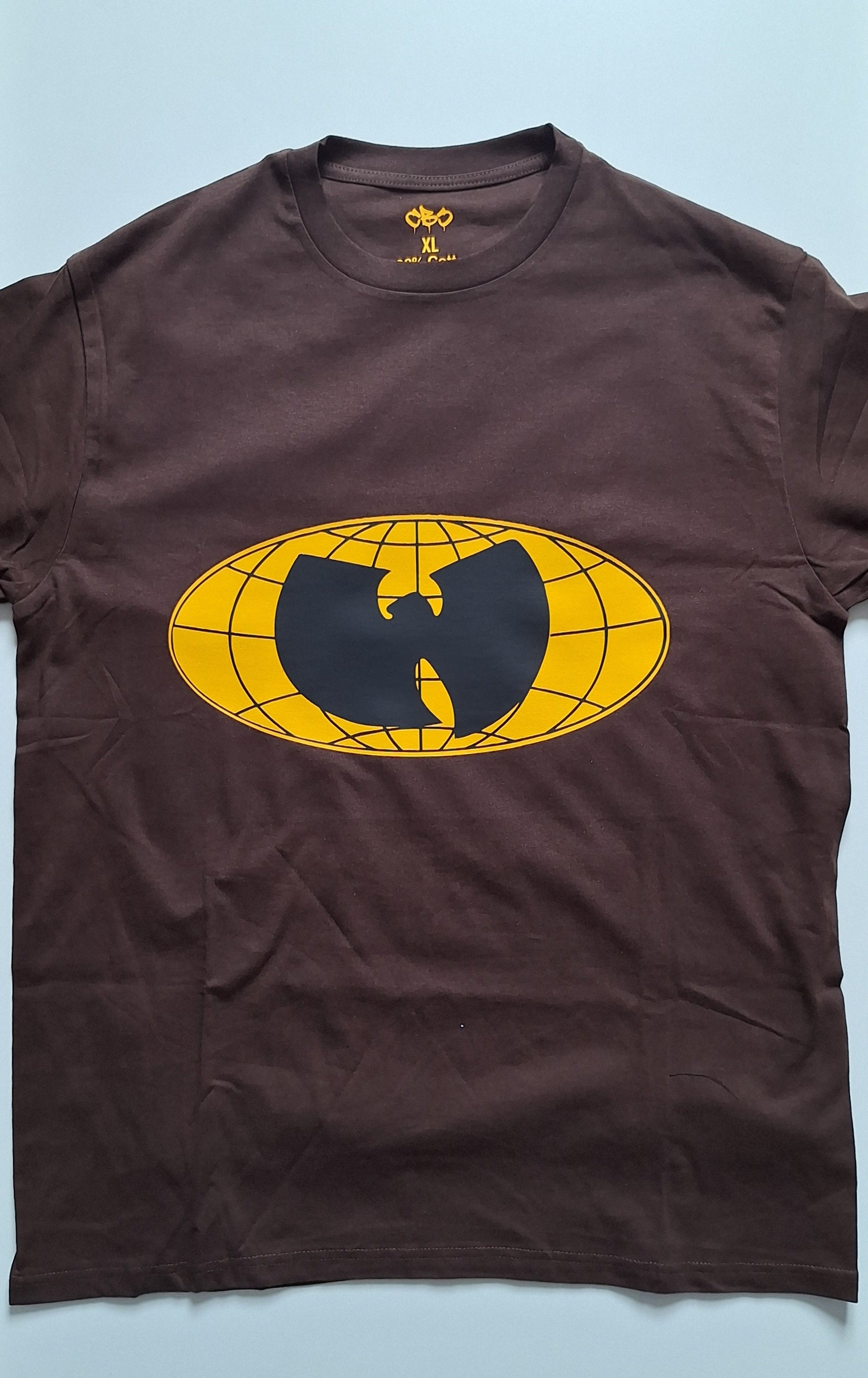 Black Wu-Tang Globe Logo on a yellow offset, all on a brown 100% cotton t-shirt